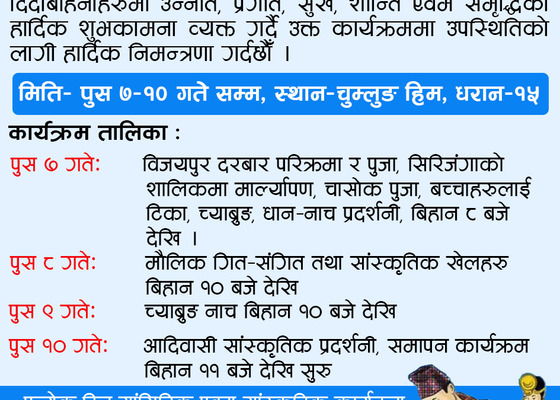 प्रकृति पुजक किराँत लिम्बुहरुको महान् चाड चासोक तङ्नाम २०७५ को अवसरमा सम्पूर्ण याक्थुङ्बा बुवाआमा, दाजुभाई तथा दिदीबहिनीहरुमा उन्नति, प