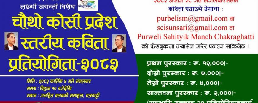 वराहक्षेत्र : वराहक्षेत्रमा क्रियाशील साहित्यिक संस्था पूर्वेली साहित्यिक मञ्च ले आगामी कार्तिक ४ गते चौथो संस्करणको कोशी प्रदेशस्तरीय