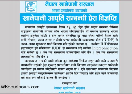 धरान : खानेपानी संस्थान धरान शाखाले आइतबार पानी आपूर्ति व्यवस्थित गर्न नसक्ने भनी प्रकाशित गरेको विज्ञप्ति गैर जिम्मेवारीको पराकाष्ठा भ