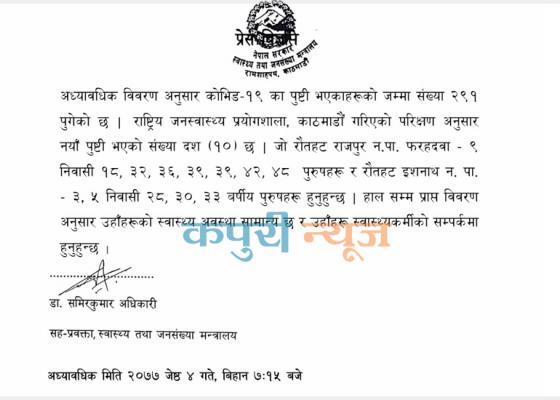 धरान : आइतबार बिहान (आज)नेपालमा थप १० जना कोरोना संक्रमित थपिएका छन् । यो सँगै नेपालमा संक्रमितको सँख्या २९१ पुगेको छ । स्