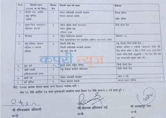 काठमाण्डौँ : २०७५ सालमा घोषणा भएका सार्वजनिक बिदाहरु यथावत राख्दै सरकारले १३ दिन थप विदा दिने प्रस्ताव गरेको छ । सरकारले सार्वजनिक बिद
