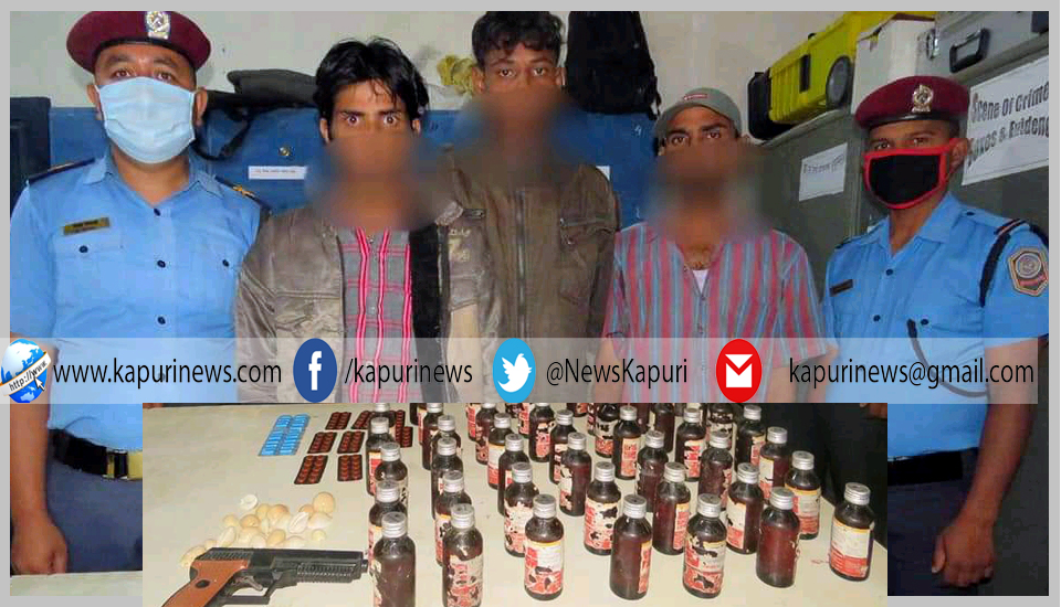 पक्राउ परेका उनीहरूको साथबाट प्रहरीले डाईलक्स डी.सी. १०० को ४७ बोतल, नाईट्रोसन ९० ट्याब्लेट , स्पास्मोप्रोक्सिवन २३ ट्याब्लेट, खेलौना प्लास्टिकको पेस्तोल १ थान, कौडा २१ थान र मोबाइल २ थान सहित पक्राउ गरेको हो । पक्राउ परेका तिनै जनाको सम्बन्धमा थप अनुसन्धान भइरहेको जिल्ला प्रहरी कार्यालय सुनसरीले जनाएको छ ।