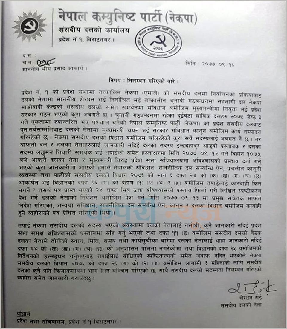 नेकपा संसदीय दलका उपनेता टंक आङ्बुहाङ्गले आचार्य संसदीय दलको नेता चयन भएको पत्र प्रदेशसभामा दर्ता गराएका छन् । उनको पत्र दर्ता भएको केही समयमै राईले १५ सांसदलाई निलम्बन गरेको पत्र प्रदेशसभामा दर्ता गराए ।
