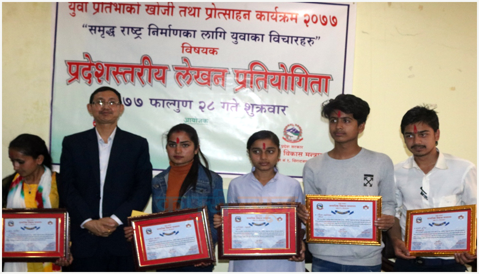 लेखन प्रतियोगितामा प्रथम, द्धितिय,तृतीय र सान्त्वना हुनेलाई क्रमशः १५ हजार, १० हजार, ६ हजार र ३-३ हजार र प्रमाणपत्र वितरण गरिएको सामाजिक विकास मन्त्रालय युवा तथा खेलकुद शाखाका अधिकृत कोमल बहादुर खड्काले जानकारी दिए ।