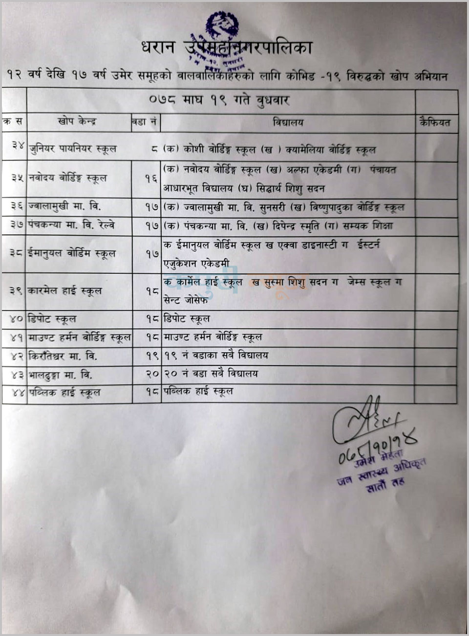 धरान उपमहानगरपालिकाको स्वास्थ्य महाशाखाका प्रमुख उमेश मेहेताले दिएको जानकारी अनुसार धरानका ४४ वटा खोप केन्द्रबाट विद्यालयमै पुगेर खोप लगाइने छ । माघ १६,१७,१८ र १९ गते तोकिएका विद्यालयको खोप केन्द्रहरूमा पुगेर १२ देखि १७ वर्ष उमेर समूहका सबै बालबालिकाले कोरोना विरुद्धको मोर्डना खोप लगाउन पाउनेछन् ।