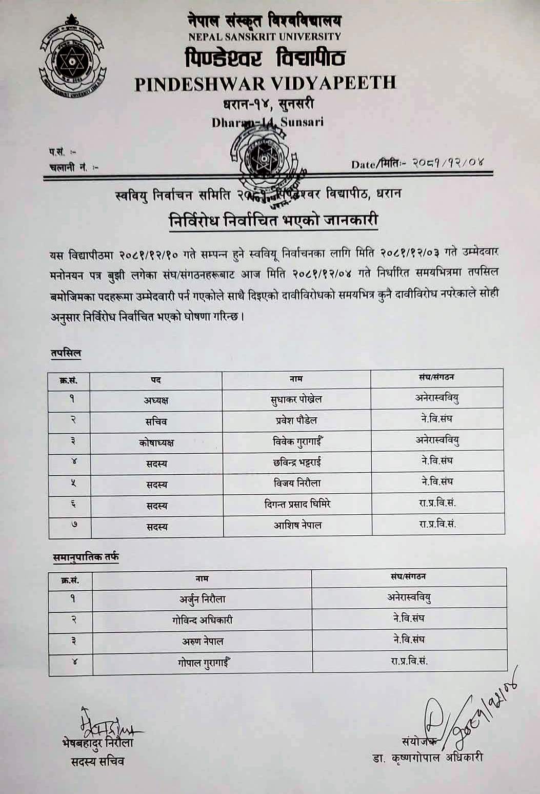 समानुपातिक तर्फ अनेरास्ववियुका अर्जुन निरौला, नेविसंघका गोविन्द अधिकारी, अरुण नेपाल, राष्ट्रिय प्रजातान्त्रिक विद्यार्थी सङ्गठन नेपालका गोपाल गुरागाईँ छन् ।